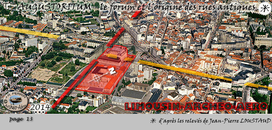 Ici la voie se scindait en deux directions: - l'une prenait la direction de l'ouest vers Chassenon et Saintes (flèches rouges plus haut). A partir du carrefour, les rues du Clos-Adrien puis Louis-Casimir-Ranson et la rue du Puy-Las-Rodas, ont gardé quelque chose de ces orientations antiques. C'était la branche ouest de la voie d'Agrippa. Elle pouvait recevoir au passage, par le nord-est et l'actuelle rue Pétiniaud-Beaupeyrat (Les 4 Chemins), un diverticule d'évitement du forum venant de la place Maison-Dieu actuelle (copie du cadastre ci-dessous). Voir également le cadastre "rose" à la page précédente : Augustoritum. |