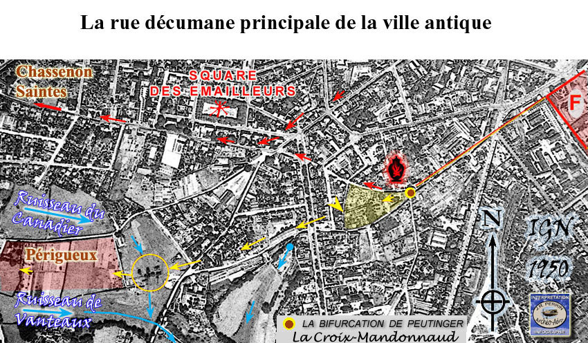 Ferdinand-Buisson (travaux de Jean-Pierre LOUSTAUD). A la limite occidentale de la ville coloniale antique, il existait ainsi un carrefour qui est venu jusqu'à nous à travers les siècles sous le nom de Carrefour de la Croix-Mandonnaud (pastille brune sur jaune). |