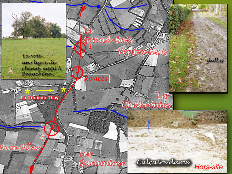 qui barrent l'exact passage de la chaussée antique, ( emplacement : pointe de flêche verte).