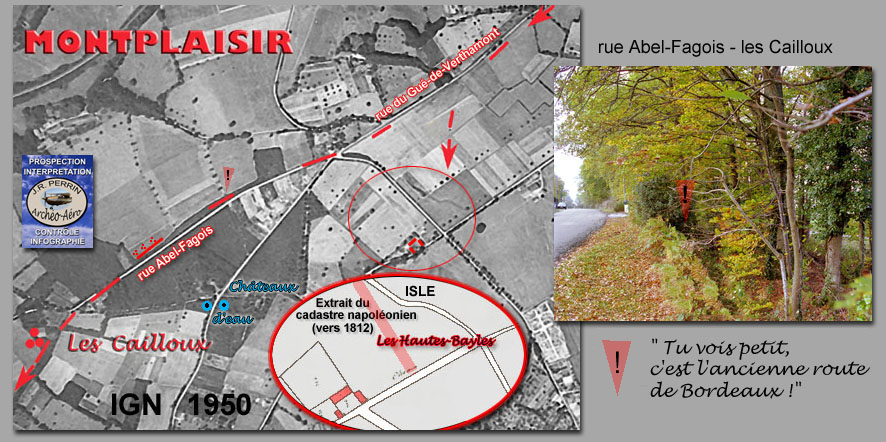C'était probablement là une des voies de Vesunna /Burdigala : Périgueux / Bordeaux (flèches jaunes sur la photo IGN de 1950, plus haut et ci-dessus). A peine plus loin, autour des années 1950, on aurait sans doute pu contrôler le passage (à gué ?) de la voie antique sur le ruisseau du Canadier au lieu-dit La Chapelle (cercle jaune cadastre et IGN 1950). Ensuite la
