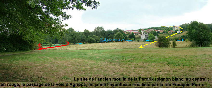 chaussée antique. Si vous passez par là, regardez bien le coin de la prairie du moulin qui aboutit au buisson perché (astérisque) : un léger bourrelet surélevé témoigne encore de la présence des restes de la chaussée romaine ! |