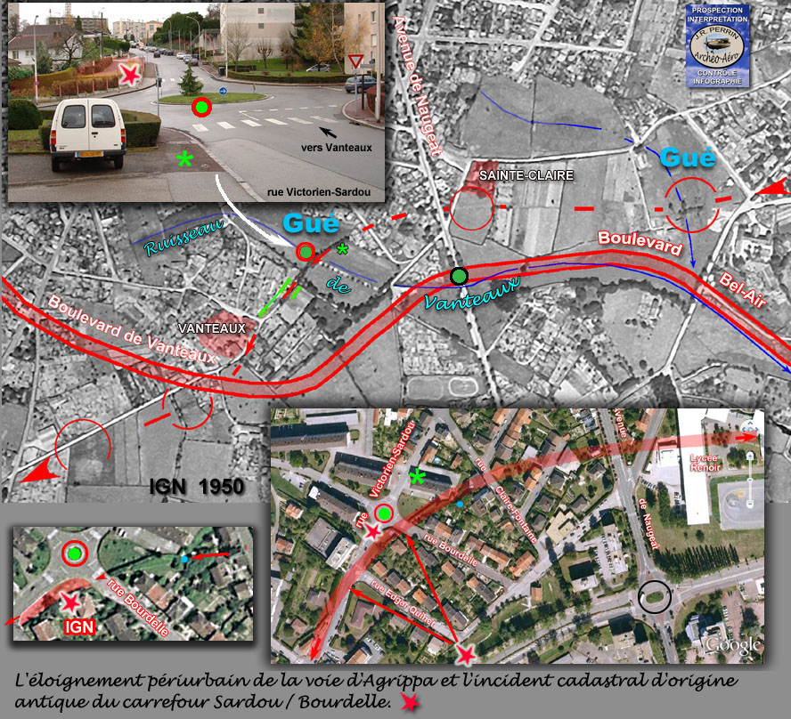 Lors de ces travaux aucune voie antique ne fut détectée ce qui est souvent le cas pour ces voies ruinées dont la signature de remblai est extrèmement floue : seule l'image aérienne sur fond de cultures, peut trahir la subtilité des perturbations physico-chimiques résiduelles du sol. Par contre les substructions d'une villa romaine furent mises au jour. Pour ce que nous savons aujourd'hui de sa position en rive d'une voie antique, la vocation de l'édifice pourrait être plus proche d'une hôtellerie que d'une demeure particulière. Nous sommes ainsi largement sortis de la ville gallo-romaine. Nous reviendrons plus loin, au bas de cette page, pour prolonger cette voie romaine précoce jusqu'au gué du Haut-Verthamont sur la rivière Vienne et son passage par le site actuel de Beynac. N B : On aura remarqué qu'il existe un prolongement à la bifurcation de la Croix-Mandonnaud selon la Table de Peutinger. Il s'agit de l'actuel Carrefour Beaupeyrat où arrivaient encore la branche nord de la voie d'Agrippa venant du passage d'eau des Casseaux par la Maison-Dieu ( ou bien et plus directement par l'actuel Carrefour Tourny). Nous ne savons pas exactement dans quel ordre ces carrefours se succédèrent : il est probable qu'ils se soient étoffés tardivement pour former un embranchement complexe. On aura ainsi remarqué que la rue des 4 Chemins se prolongeait en 1812 (vieux cadastre) par un court emprunt à l'actuelle rue des Pénitents-Rouges via le parvis de l'Eglise St-Cessateur. Cet itinéraire a été redressé et est représenté de nos jours par la rue Pétiniaud-Beaupeyrat. |