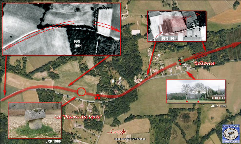 La borne routière dite 'Pierre du Mail" Les images se suffisent à elles-mêmes. Et depuis des temps immémoriaux une borne routière antique replantée à l'envers, nous cache toujours une éventuelle inscription. La photo aérienne de l'IGN de 1964 et notre contrôle au sol, attestent qu'elle n'a pas dérivé depuis l'époque antique. Elle présente une élévation biaise par rapport à son socle (?) Bellevue Plus loin,