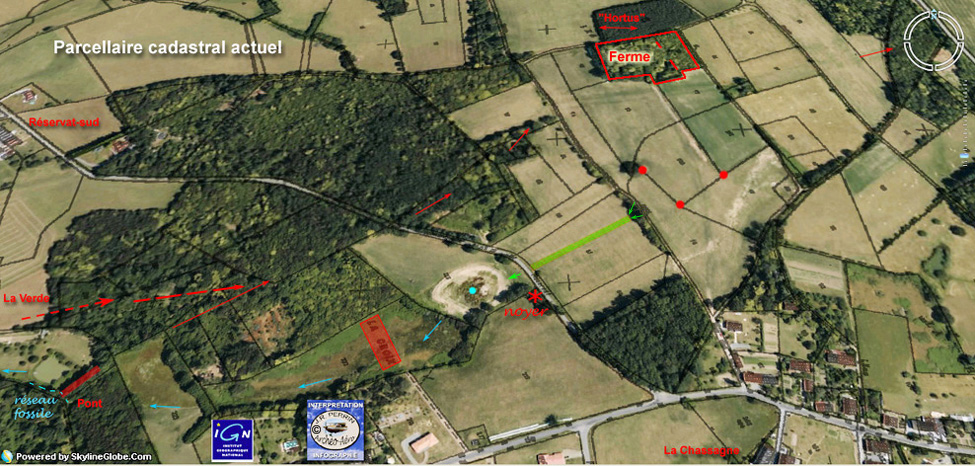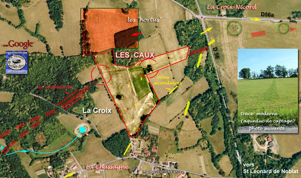 Enfin c'est une propriété privée. Pendant ce temps Couraud, plein de bon sens et imprégné sinon connaisseur des us et coutumes antiques avait contourné la tête de source du ruisseau (dit de la Croix) et rejoint la Croix de Nicord par une voie encore utilisée au XIXème siècle et dont le tracé en flexions alternées bien apparent sur les photos, est typique des itinéraires d'origine antique (flèches jaunes). Evidemment il s'agit probablement d'une voie de l'antiquité tardive voire du Haut-Moyen-Age, et qui est venue à moindre frais, remplacer la grande voie institutionnelle trop incommode et son diverticule haut-perché. Tout cela tombé en désuétude et ruinée par les aménagements agricoles et les prélèvements des riverains. Et depuis lors, à toutes les époques, d'autres cheminements furent créés et tous peu ou prou, ont laissé des traces. |