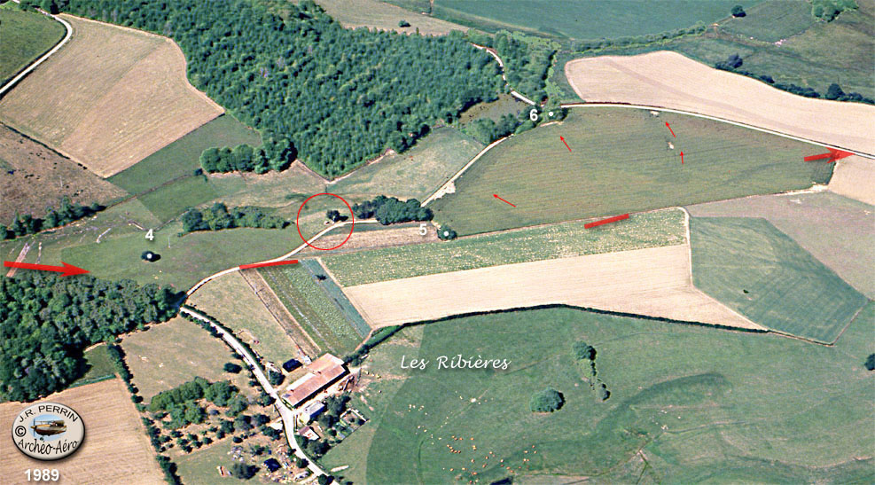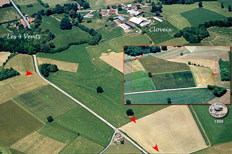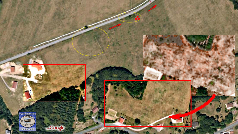 Sur la grande pièce en maïs (ci-dessus) les petites flèches signalent les fossés résiduels de petits cheminements ou des limites d'anciennes parcelles; les autres linéaments observables ailleurs sur le site sont probablement d'origine géologique. |