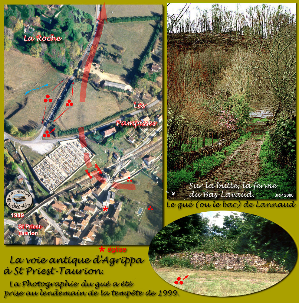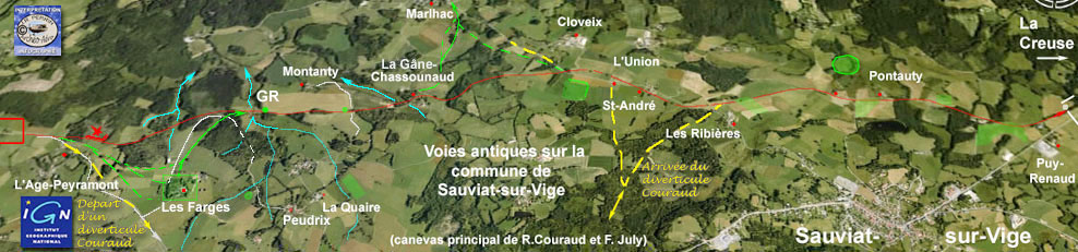 Depuis l'Union une longue descente amène la voie jusqu'au gué de St André (le "Got St-André" de Couraud). Notre route antique va alors occuper le faîte d'une longue dorsale entre deux ruisseaux.jalonnée par deux arbres remarquables : 4 et 5 de la photo "Arbres". Enfin c'est la plongée vers la zone basse occupée par des affluents de la Vige canalisés à l'époque de la photo par des réseaux d'irrigation et de drainage. Avant de passer la Vige légèrement en amont du pont actuel et de remonter par La Martine vers les hautes terres de la Creuse. Ce long passage a été décrit de longue date par les érudits limousinset je ne peux que vous le montrer avec quelques détails qui n'étaient pas à leur portée il ya plus d'un siècle. Et Raymond Couraud nous rappelle tout cela dans son texte : Voies romaines de la Haute-Vienne : " VI Voies romaines et chemins antiques dans la région de Sauviat par Raymond COURAUD et François JULY", dans Bulletin de la Société Archéologique et Historique du Limousin, tome 95, 1968. La seule incertitude mineure résiderait dans la place