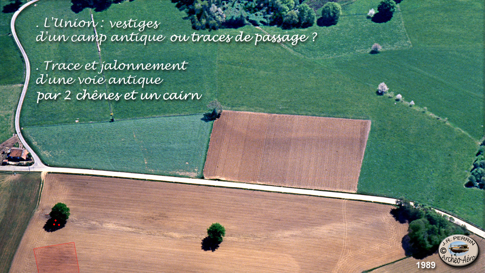 Enfin le nom du lieu : "l'Union", venant en droite ligne du latin, appelle la notion de réunir, de joindre . . . ainsi qu'il sied à un concours de voies. Dans la parcelle de l'autre côté de la route, une trace claire pourrait marquer une ancienne levée de terre arasée par les labours. Parallèlement l'arrêt de la colluvion de versant aurait créé à son pied une trace plus sombre venant de matières organiques accumulées durant des siècles. Et si nous avions pu observer des labours sur les parcelles voisines, nous en aurions sans doute appris davantage. La large courbe de la voie antique contournant le site permet cependant de penser à un petit camp d'étape militaire sur la route antique de Lyon : l'indice est bien sûr totalement nivelé.
