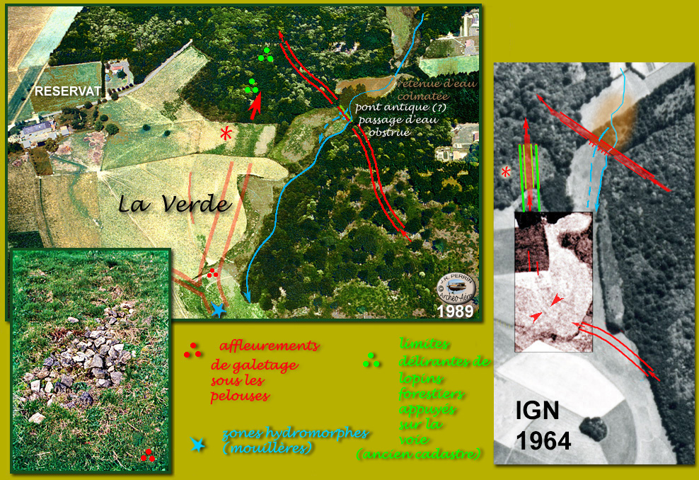 Finalement la circulation d'attelages agricoles était parfaitement possible sur l'ouvrage en enjambant cette modeste rigole qui allait cascader en aval. En dépit des apparences suggérées par les photos aériennes ce passage à pont nous avait semblé être le trajet des origines. Le transit par la Verde se heurtant en aval du pont, à d'importantes mouillères puis à l'escalade d'un ressaut pour atteindre le niveau d'un plateau agricole où curieusement les traces de la voie étaient toujours présentes. On pouvait dès lors penser être en face d'une terrasse issue d'incidents fluviatiles naturels très anciens. Finalement l'importance de l'emprise routière suggérée par les photos, des limites communales (avant remembrement) bordées de microparcellaires délimitant des lopins forestiers totalement délirants, des affleurements de galetages sous les pelouses . . . ont fini par nous convaincre de la grande ancienneté et de l'antériorité de la voie de la Verde. Petite incidence :