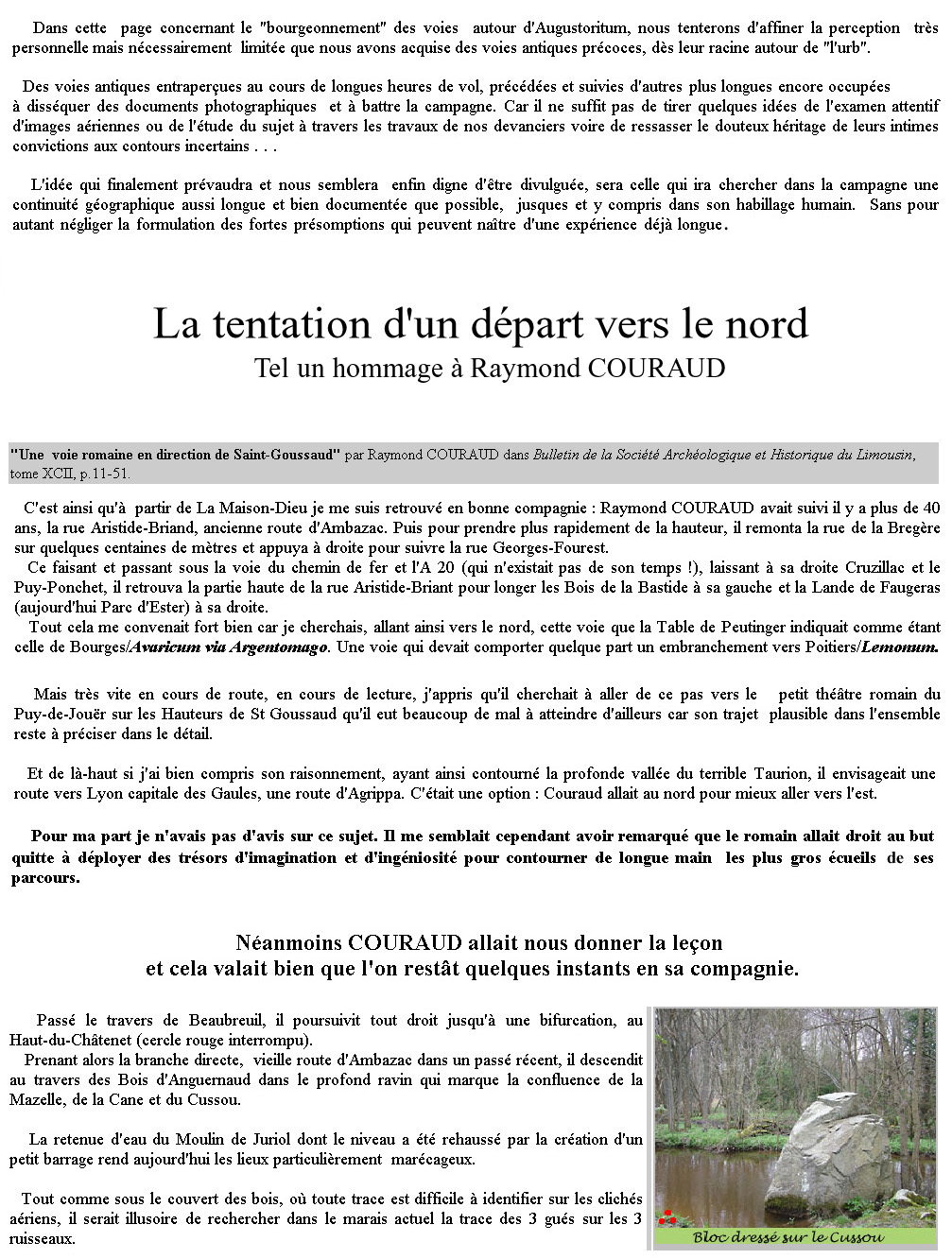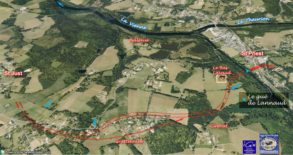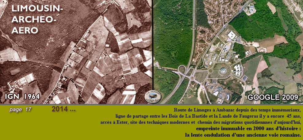 En comparaison, ce que nous offre l'itinéraire de l'érudition locale dont nous avons débattu à la page précédente est riche de péripéties, rappelons-nous : après une dernière et confortable montée de la Maison-Dieu au plateau de Beaubreuil c'est la descente des bois d'Anguernaud, le trou improbable de Juriol, la rude montée vers Puy-Neige, une nouvelle descente vers un gué sur le Taurion, la longue traversée d'un bec alluvial exposé aux crues de 2 rivières (la Vienne et le Taurion) et le franchissement d'un dernier ravin généreusement creusé par le ruisseau descendant de Réservat. Et tout cela pour un parcours total sensiblement plus long. Ils n'étaient quand même pas si fous que cela ces romains qui avaient quelques décenies plus tôt, écrasé leurs voisins gaulois grâce à une grande maîtrise du terrain ! Et sur un itinéraire stratégique aussi important que la voie de Lyon à Saintes, nous les voyons difficilement et de propos délibéré, affronter inconsidérément des terrains difficiles et risquer de se perdre dans des Roncevaux escarpés et des Dien-Bien-Phu fangeux ! |