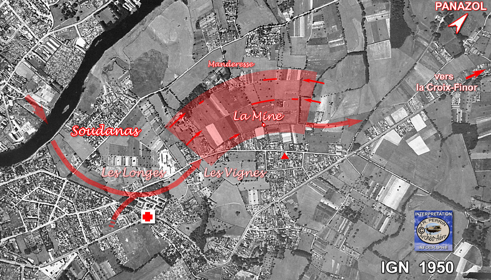 Et il envisagea également qu'un second gué ait pu exister en aval, dans le profond méandre du Moulin Garat. En effet - et bien que le détail ne figure pas sur les photos de 1960 - sur les clichés de 1964, une trace de voie existe bien sur le promontoire qui domine l'ancien moulin : sur les photos IGN, nos pointes de flèches rouges affrontées sont sans doute assez explicites pour qu'il ne soit pas utile d'en dire davantage. Et ces deux dernières options se raccordent magnifiquement à une longue montée qui aboutit à Puy-Neige. Chapeau, l'artiste ! Comme un ersatz pour la voie d'Agrippa
