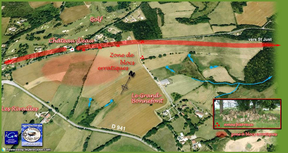 des blocs approvisionnés en rive des voies.Un important cairn d'épierrement des labours existe en bordure de la voie de desserte de la ferme de Bonnefont (photo). Enfin dans l'angle des deux routes, un vaste espace est parsemé de blocs erratiques (au sens historique du terme). Au dire d'un exploitant agricole rencontré sur le site, ils sont suffisamment imposants pour qu'il soit plus rentable de les contourner lors des façons agricoles, plutôt que de tenter de les extraire et de les évacuer. Nous avions contrôlé sommairement à la jumelle ce site il y a 10 ans. La zone est actuellement couverte par du maïs en tige, il faudra attendre l'hiver pour une nouvelle visite voire un inventaire. |