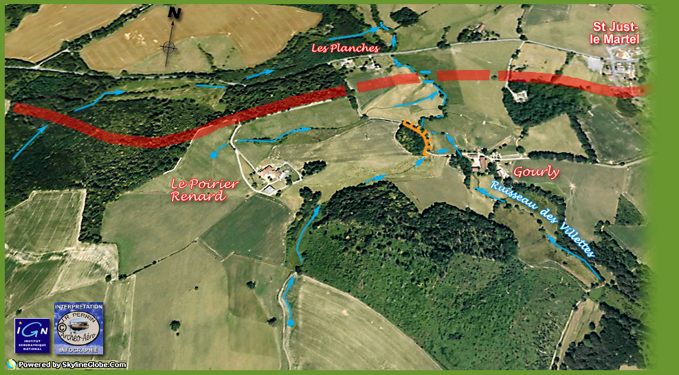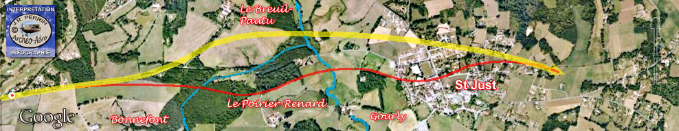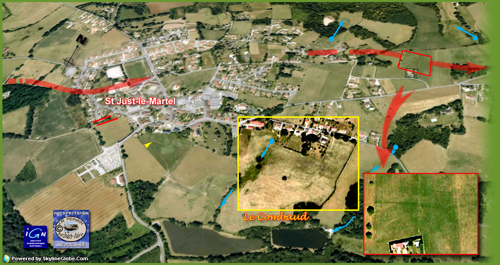 Mais, mon propos était surtout de montrer qu'une voie antique vers le nord était crédible au départ de la Maison-Dieu. Alors dans le chaos ambiant, j'ai quitté les routes de Raymond Couraud à hauteur du Châtenet. Depuis cinquante à soixante ans les photos de l'IGN mais également et depuis quelques années les couvertures en continu de l'internet, rappellent qu'un chemin direct vers Rilhac-Rancon a un jour existé : il suffit, après la Lande de Faugeras (Ester), de continuer tout droit par les très actuelles rue de Faugeras puis d'Enguernaud (en ignorant Beaubreuil à gauche et le Châtenet à droite). Passé le travers de l'ancienne ferme d'Enguernaud précisément, il faut plonger tout droit vers la Mazelle (le ruisseau), passer l'eau sur un ancien gué et chercher le meilleur choix romain permettant d'accéder à Rilhac-Rancon (rue Victor-Hugo) et à son faubourg au nom prédestiné : Le Peyrou. Cette échappée d'une voie vers le nord est décrite par le fonds photographique IGN de 1964 (ci-dessus) et son rajout de couleur sépia (en haut du document) qui nous amène jusqu'à une nouvelle bifurcation (point rouge) à mi-chemin de la ferme de Janailhac dont nous avons eu l'occasion de parler en page 4 ("une virée de galerne") de notre site internet. Sur le document couleur sépia ci-dessus on observera que le vieux bourg de Rilhac-Rancon n'est pas situé sur le passage antique et que curieusement, un noyau d'habitats s'est entretenu sur la voie au lieu-dit le Peyrou ("l'endroit pierreux"). Mais nous n'avons pas pu résister à l'appel d'une vieille photo verticale de l'IGN (1959) que nous avions reproduite il y a bien longtemps. Moins soumise au relâchement agricole que les missions verticales qui ont suivi, elle est encore plus précise par quelques signes induits. Découpée en tranches pour tenir moins de place, elle nous restitue s'il en était encore besoin, un "profil en long" miraculeusement préservé. Le cliché de GOOGLE (2009) copieusement renseigné, exposé ci-dessous, fait suite au cliché IGN (1964) de teinte sépia. Sa partie centrale nous est connue depuis la page : "une virée de Galerne" évoquée ci-dessus. L'implantation schématique de la villa d'Arédius (Saint-Yrieix) montre que sa forme fut sans doute contrainte à la dissymétrie par la présence d'une autre voie antique (secondaire ?), elle-même affectée d'un détour pour contourner une tête de source près de la ferme actuelle de Janailhac. Fernand GAUDY nous signalait en 1995 que les domaines de Janailhac, Bâtissou et Theillet avaient appartenu à l'Abbaye de St Martial jusqu'à la Révolution. Et nous rappelons que ce remarquable et savant autodidacte nous précisait alors que " Saint-Yrieix, dans son testament daté de 570, donne une villa au lieu de Genelac (ou un nom semblable qui n'a pas été identifié) à cette même abbaye". On voit sur notre surcharge d'interprétation qu'en l'absence de tout autre indice perceptible sur les clichés, le tracé du "chevelu hydrographique" avec localisation des têtes de source, permet de restituer sur des lisières de bois le passage fossile de la voie antique de Bourges. Une orientation de recherche à vérifier cependant impérativement sur le terrain. Les reports hydrographiques sont issus des cartes IGN au 1/25000ème (2030 Est et 2031 Est) comme seuls documents suffisamment détaillés pour servir de référence dans ce cas précis.