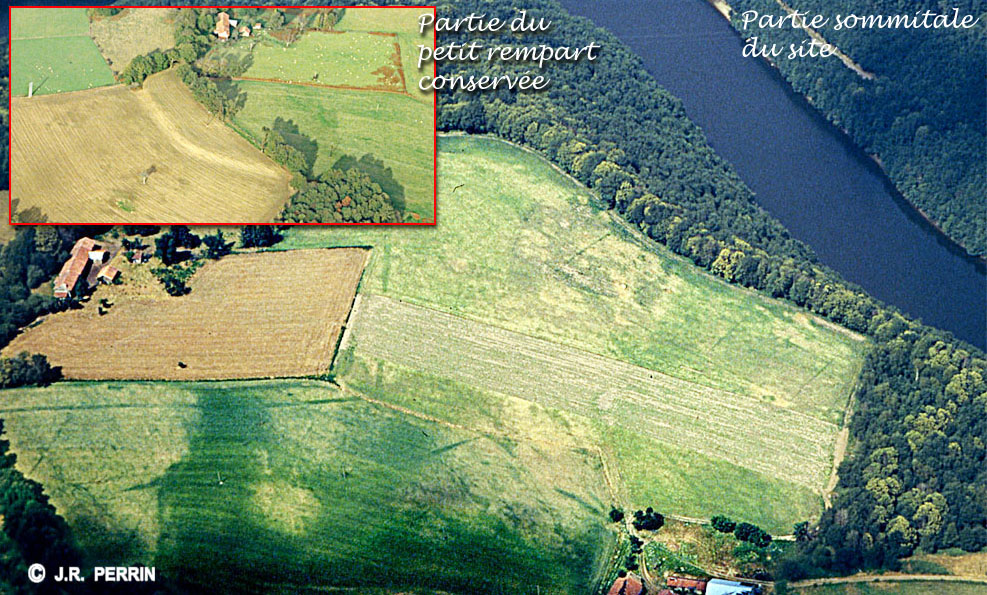 Au nord (à gauche) les éboulis linéaires du mur fortifié de La Clautre se manifestent par leur pouvoir asséchant : teinte claire dans le spectre visible. Les traces sont suffisantes pour permettre de conclure à une porte dans la fortification, défendue en avant, par un possible"fortin" (à double enceinte ? Voir la vignette ci-dessous) dont les vestiges d'écroulement persistent sous la forme de placages fortement chargés d'humus qui apparaissent, en teinte sombre lors des périodes pluvieuses (cf "L'Oppidum... 2ème partie). Ces deux indices archéologiques majeurs figuraient sur le document IR de Pierre Rigaud et la clé de leur interprétation était explicite dans le travail de ce scientifique. On sait par contre qu'à cette époque, leur nature, leur intérêt scientifique et leur signification se situaient au-delà de toute expérience et donc de toute analyse, de la part de l'archéologie. Enfin une petite villa rustique avec en interne, trois compartiments