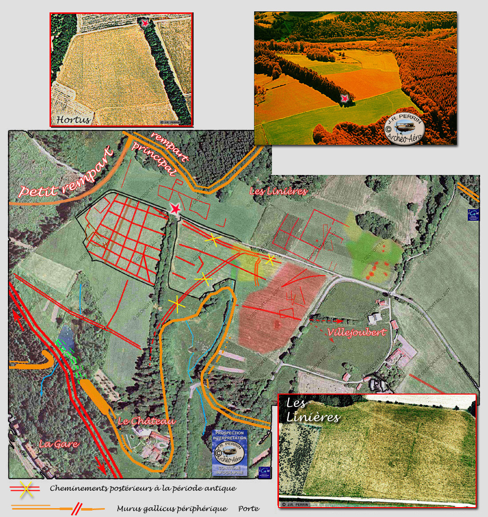7 - Extrémité du "petit rempart" : porte inachevée (en vert) 8 - Parcellaires en damier : les " hortus" 9 - Ferme, annexes et parcellaires sur le plateau des Linières 10 - Aqueducs vers des structures d'habitat (villas gallo-romaines ?) . 11 - Porte des Sagnettes 12 - Route protohistorique Est d'accès à l'Oppidum 13 - Enclos rectangulaire sur la route de jonction des gués de Vienne et de Maulde. Emprise de structures d'habitats près de Chez-Garaud 14 - Eperon barré avec système de fortification d'entrée. Plus loin à l'est, traces d'un chemin d'accés à un habitat éventuel, sur un replat de confluence, au sud des Champs (voir mosaïque verticale). |