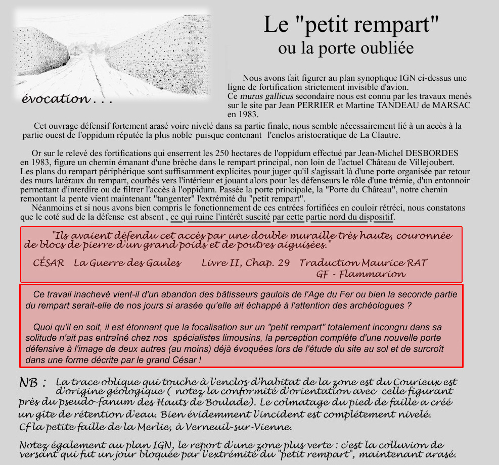 remplacés (figurant en blanc sur notre cliché). Nous rappelons que les uns et les autres perforent et démolissent les murs de défenses gaulois (murus gallicus) en dehors des portes protohistoriques et antiques connues : ils ne peuvent en aucune façon constituer des repères historiques pour l'époque de l'Age du Fer qui nous intéresse. Cependant leur datation erronnée a donné lieu à la notion téméraire et hardie d'oppidum routier, un oxymoron limousin. |