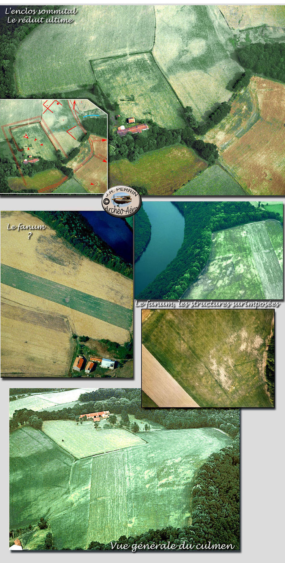 structures observées. Sur ce même panneau on remarquera, à l'est de l'ancienne ferme et en lisière des bois, une trace carrée légèrement engagée sous le couvert forestier, autour du point culminant de l'oppidum, le culmen. Il s'agit probablement d'un sanctuaire, un fanum, avec une possible cella centrale circulaire, prolongé par une esplanade de façade au sud-ouest : images au centre du panneau ci-dessus. Un chemin coudé émane de l'angle sud-est du sanctuaire et se dirige vers le Sud, vers la ferme actuelle du Taret. Des enclos carrés contigus, postérieurs à la ruine de l'édifice cultuel, se remarquent en surimposition; ils s'étendent vers le sud-est. Nous évoquons encore ci-dessus et ci-dessous la tombée aride (couleur claire) du murus secondaire de La Clautre qui forme la limite ouest d'un tertre. Sous certains aléas météorologiques, celui-ci semble bien recouvrir, des indices diffus d'enclos et de cheminements qui occupent le haut du terrain qui verse vers le Château du Muraud. Il faut savoir en effet que toute photo aérienne oblique sur un sol varié constitue, peu ou prou, une trahison topographique. La photo verticale apporte à cet égard, une distorsion moindre. Mais le rôle essentiel de ces documents, est de révéler au sol et de cibler des indices qui resteraient illisibles sans le recul que donne l'altitude. Les techniques actuelles et à venir de la géodésie informatisée sont les premières bénéficiaires de cet éclairage : les photos de la prospection aérienne assument ainsi essentiellement un rôle précurseur mais déjà éclairant, pour les travaux de l'archéologie de terrain. |