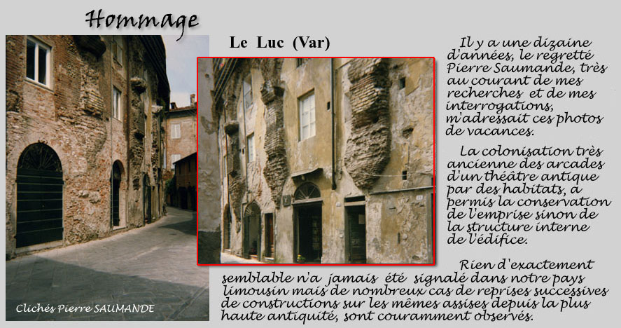 outrepassée. Car comment expliquer autrement la conservation encore très évidente, du long alignement courbe des façades qui borde à l'est l'ancien Faubourg (devenu rue) du Pont-St-Martial. Une rue dont le tracé s'infléchit toujours comme pour laisser place encore à l'arrondi de l'imposante façade du monument. Et l'amorce d'un chemin (l'Impasse des Teinturiers d'aujourd'hui) qui suit la courbe de l'énorme bâtiment, fut l'un des accès à la ville du Bas-Empire. En tout état de cause, il s'agissait sans doute d'un véritable "monument" dont le diamètre pouvait approcher les 200 mètres : à égalité alors avec le théâtre antique d'Autun, réputé le plus grand des Gaules. Une dimension troublante tant elle est loin des 82 mètres proposés récemment par les fouilleurs qui en retrouvent sporadiquement les substructions internes lors des travaux de voirie. Avec de surcroît un "petit pont St Martial" qui, bien que d'origine romaine, a toujours été jusqu'à nos jours, constamment tenu par l'érudition locale, à l'écart des grands itinéraires antiques. Serait-ce par manque de curiosité et d'imagination, que les limousins que nous sommes, se complairaient dans leur tendance à l'autodénigrement : un pont de grande renommée certes mais notoirement dévolu à de petites voies antiques incertaines, après avoir "fleureté" avec un petit théâtre . . . |