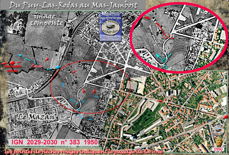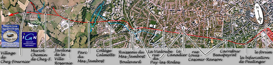 Observez la très large ouverture du vallon creusé en quelques millions d'années par le ruisseau du Mas-Jambost maintenant canalisé, en souterrain bien évidemment. La vaste dépression de la rue Brémontier vue depuis la descente du Puy-Las-Rodas n'est pas le passage de la voie antique comme cela a pu être écrit récemment dans la littérature locale. Les tranchées routières romaines ne dépassent pas 15 à 20 mètres de large et présentent des flancs évasés à 45° environ, pour un profil "en auge de maçon". La voie antique ? Mais elle est là, sous le Puy-las-Rodas et nous stationnons dessus pour quelques mètres encore ! Décidément nous avons trop tôt parlé de nos recherches sur cette voie d'Agrippa, trop projeté de photos ici et là, trop accompagné d'amis, amateurs de vieilles pierres sur cette antique voie et ailleurs. Nous récoltons maintenant dans des publications qui se voudraient sérieuses, des anecdotes isolées, portées par la rumeur et que leurs auteurs entre deux divagations, tentent de loin en loin, de coller bout à bout pour créer à leur avantage une longue page qui se |