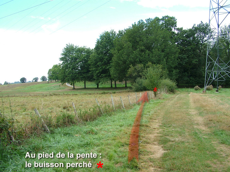chaussée antique. Si vous passez par là, regardez bien le coin de la prairie du moulin qui aboutit au buisson perché (astérisque) : un léger bourrelet surélevé témoigne encore de la présence des restes de la chaussée romaine ! |
