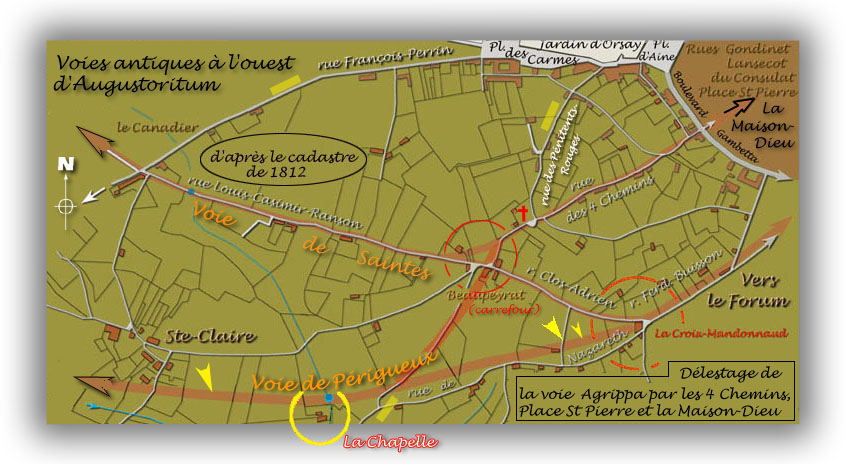 Lors de ces travaux aucune voie antique ne fut détectée ce qui est souvent le cas pour ces voies ruinées dont la signature de remblai est extrèmement floue : seule l'image aérienne sur fond de cultures, peut trahir la subtilité des perturbations physico-chimiques résiduelles du sol. Par contre les substructions d'une villa romaine furent mises au jour. Pour ce que nous savons aujourd'hui de sa position en rive d'une voie antique, la vocation de l'édifice pourrait être plus proche d'une hôtellerie que d'une demeure particulière. Nous sommes ainsi largement sortis de la ville gallo-romaine. Nous reviendrons plus loin, au bas de cette page, pour prolonger cette voie romaine précoce jusqu'au gué du Haut-Verthamont sur la rivière Vienne et son passage par le site actuel de Beynac. N B : On aura remarqué qu'il existe un prolongement à la bifurcation de la Croix-Mandonnaud selon la Table de Peutinger. Il s'agit de l'actuel Carrefour Beaupeyrat où arrivaient encore la branche nord de la voie d'Agrippa venant du passage d'eau des Casseaux par la Maison-Dieu ( ou bien et plus directement par l'actuel Carrefour Tourny). Nous ne savons pas exactement dans quel ordre ces carrefours se succédèrent : il est probable qu'ils se soient étoffés tardivement pour former un embranchement complexe. On aura ainsi remarqué que la rue des 4 Chemins se prolongeait en 1812 (vieux cadastre) par un court emprunt à l'actuelle rue des Pénitents-Rouges via le parvis de l'Eglise St-Cessateur. Cet itinéraire a été redressé et est représenté de nos jours par la rue Pétiniaud-Beaupeyrat. |