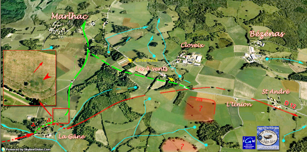Nous prolongeons le tracé de cette jonction jusqu'à Marlhac comme le côté d'une bifurcation "en triangle" vers l'hypothèse St-Goussaud avec une petite hésitation entre un chemin actuel qui monte vers le nord et, à partir du carrefour intermédiaire, une trace assez vague, à gauche, dans la culture. Le positionnement du 3ème côté porté en tiretés verts, demande à être évalué sur le terrain à partir d'une courte section reconnue près de Marlhac. Ainsi, les bifurcations de voies antiques observées en étoile à trois branches, se résolvent généralement à distance par un troisième côté qui fluidifie le cheminement et nous ramène au cas général du triangle, le trivium antique : du grand art antique illustré ici et qui ne se renouvellera plus au cours de l'histoire. A noter que Couraud situait une bifurcation en étoile à quelques mètres de là, récupérant le tracé de la route des Quatre-Vents (flèches jaunes). Pourquoi pas ? Et à hauteur des Ribières, il formait tout naturellement un raccord en triangle sur la voie principale avec un itinéraire venant de l'Age-Peyramont - comme une alternative sans doute un peu trop longue à mon goût - mais qui lui avait permis de contourner un maximum de sources. On observera