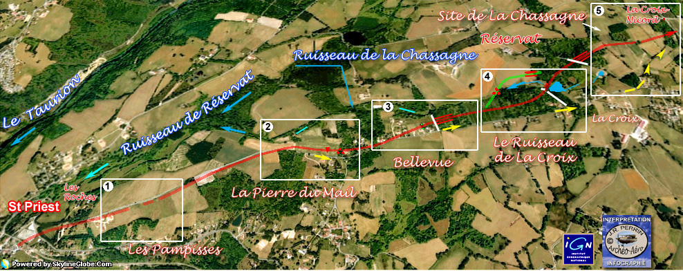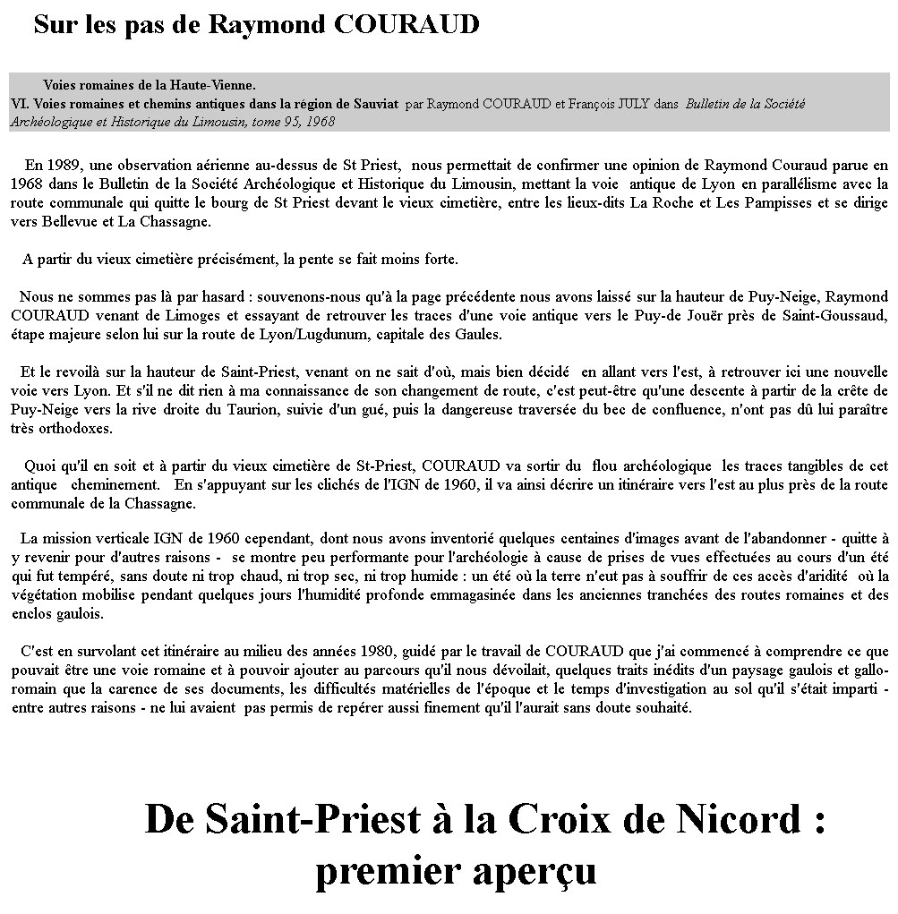 Cette première partie de parcours dont nous marquons la continuité en rouge, n'est pas à l'abri d'interrogations ne serait-ce que dans son parti-pris d'affronter une traversée du ruisseau de la Chassagne (ou de la Croix, c'est le même) qui pouvait être facilement contourné sans allongement de parcours (ce qu'a fait COURAUD en suivant la route) et par la présence d'un diverticule dont nous comprenons mal la nécessité. L'itinéraire proposé par COURAUD matérialisé par des flèches jaunes sur notre plan IGN, suit la route communale de St Priest à la Chassagne (La Croix) puis un ancien chemin rural jusqu'à la Croix-de-Nicord. Rien dans ses documents ne lui permettait de penser qu'il put en être autrement jusqu'à ce carrefour tant le profil de chemins assurément très anciens, simples traces invisibles au sol pour certains, quittant la route communale à la Chassagne, servait son projet. Un projet que n'aurait pas désavoué le plus pointilleux des ingénieurs romains à ceci près que, comme toujours, certains traits de l'environnement politique, matériel et humain de l'époque nous échapperont toujours. |