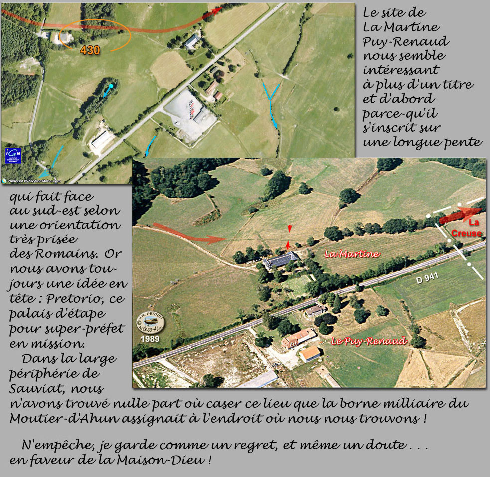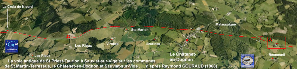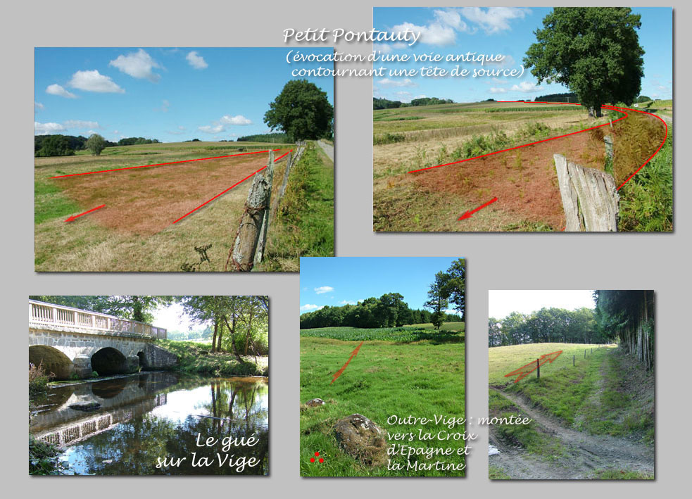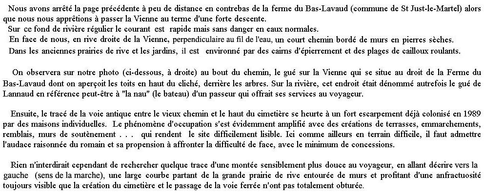 Depuis l'Union une longue descente amène la voie jusqu'au gué de St André (le "Got St-André" de Couraud). Notre route antique va alors occuper le faîte d'une longue dorsale entre deux ruisseaux.jalonnée par deux arbres remarquables : 4 et 5 de la photo "Arbres". Enfin c'est la plongée vers la zone basse occupée par des affluents de la Vige canalisés à l'époque de la photo par des réseaux d'irrigation et de drainage. Avant de passer la Vige légèrement en amont du pont actuel et de remonter par La Martine vers les hautes terres de la Creuse. Ce long passage a été décrit de longue date par les érudits limousinset je ne peux que vous le montrer avec quelques détails qui n'étaient pas à leur portée il ya plus d'un siècle. Et Raymond Couraud nous rappelle tout cela dans son texte : Voies romaines de la Haute-Vienne : " VI Voies romaines et chemins antiques dans la région de Sauviat par Raymond COURAUD et François JULY", dans Bulletin de la Société Archéologique et Historique du Limousin, tome 95, 1968. La seule incertitude mineure résiderait dans la place