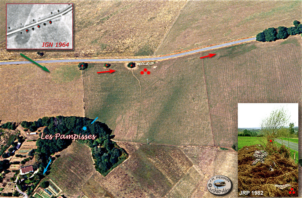 . la première, à gauche, semble trahir une structure en damier que nous rattacherions à notre corps défendant et faute de mention explicite dans la littérature archéologique locale, aux coutumes agricoles de l'époque gallo-romaine : les "hortus". Dans son angle nord, sur la trace antique présumée, figure une trace ovoïde de remontée d'humidité avec en son centre une tache ponctuelle plus claire : nous avons rencontré une structure exactement similaire en bordure de la voie de Limoges à St Gence au lieu dit "Petit-Bellegarde". Origine anthropique probable pour un usage inconnu.Voir notre page : "Voie de Rancon", autre site. . parcelle centrale : pas de commentaire archéologique évident. Deux plans de fracture du socle géologique guident des remontées d'humidité. Et un cairn d'épierrement approvisionné lors des labours, exposé à des prélèvements sporadiques et souvent recouvert de fougères. Actuellement il est surmonté d'un énorme massif arborescent en boule, composé d'un saule et d'un sureau rassemblés près desquels les bovins viennent se mettre à l'ombre (cercle de piétinement) en suivant une "traulhe" étonnamment précise. Voyez ce qu'il en était il y a 30 ans (1964). Le saule attiré par l'eau qui circule dans les restes de chenaux antiques et le sureau qui n'est jamais loin des haltes du voyageur . . parcelle de droite : deux ou trois traces biaises (est-ouest) à peine perceptibles, à recoupement orthogonal possible. Des très vieux parcellaires, des enclos de haute tradition ? Le cadastre de 1810 ne signale rien, sinon de grandes parcelles ouvertes. Notez les auréoles d'assèchement autour d'une rangée de chênes, en bordure de la route. Ces parcelles au centre du cliché, sont parcourues par des linéaments non organisés où l'on pourrait voir la main de l'homme du dernier Age du Fer