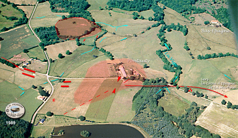 la Vige et son affluent. Cerclé de rouge, au nord-ouest de Pontauty, un petit camp à enceinte fossoyée et talutée, probablement antérieur à l'époque romaine. Le site de Pontauty lui-même occupe le sommet d'un mamelon d'interfluve de cote 405. Et au sud de Pontauty, au-dessus de l'étang, à gauche d'un ancien chemin évoqué par un trait tireté, de vagues traces pourraient être, au vu de leur emprise, les modestes restes d'un habitat antique (astérisque, ci-dessus). |
