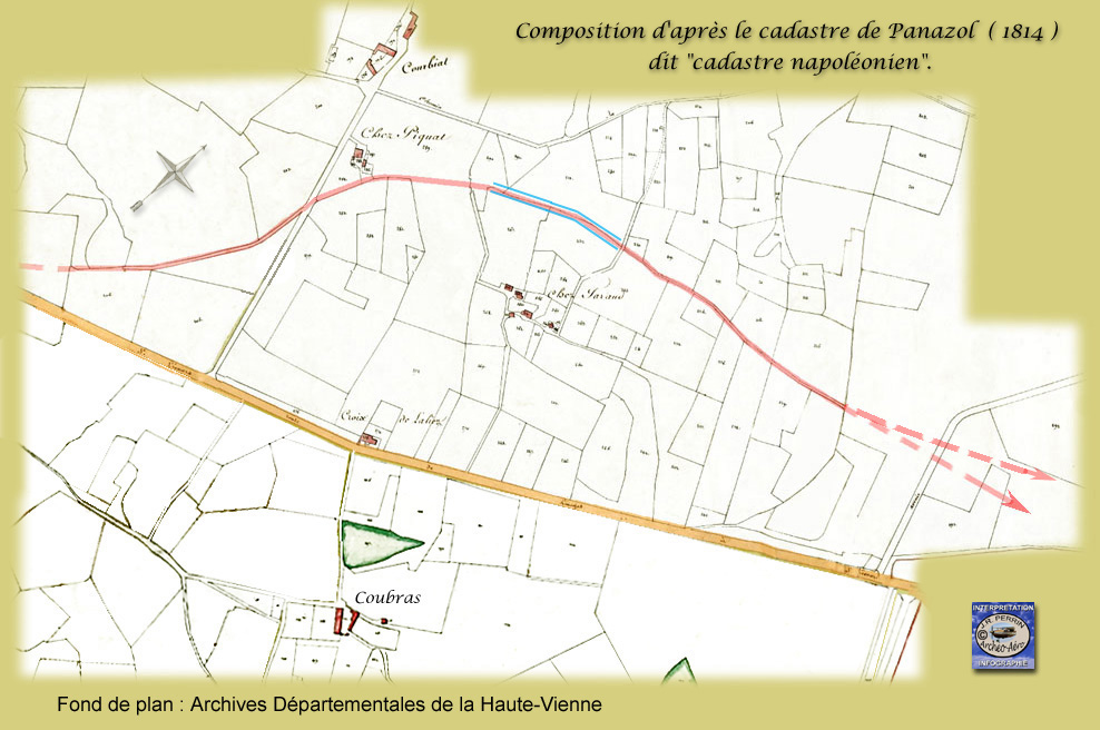 d'atteindre le plus directement possible, la crête de Puy-Neige.Mais, revenons en arrière : pour le difficile passage du "Ruisseau du Palais" - ainsi que se nomme nous l'avons dit, à partir du Moulin de Juriol, la conjonction de la Mazelle, de la Cane et du Cussou - COURAUD avait d'autres cordes à son arc. Il avait remarqué que la seconde branche de la bifurcation du Haut-Châtenet (peu après Beaubreuil) plongeait en deux longues courbes alternées vers le site de l'église du Palais-sur-Vienne qui passe avec quelque raison sans doute, pour avoir été l'emplacement de la villa antique de Jocondiac (disque rouge) et qui fut plus tard, autour de l'an 800, le site du palais du fils de Charlemagne, Louis le Débonnaire, Roi d'Aquitaine et Empereur d'Occident à la mort de son père. Concernant l'âge de notre itinéraire et sa pérennité dans le paysage historique, la remarque valait tous les latins du monde ! Et là aussi sur cette très vieille route, des vestiges historiques nourrissaient des rangées de pommiers (autre point d'exclamation jaune !). Il fit alors une