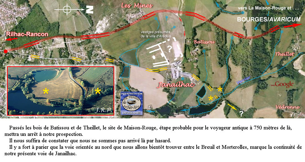 Mais, mon propos était surtout de montrer qu'une voie antique vers le nord était crédible au départ de la Maison-Dieu. Alors dans le chaos ambiant, j'ai quitté les routes de Raymond Couraud à hauteur du Châtenet. Depuis cinquante à soixante ans les photos de l'IGN mais également et depuis quelques années les couvertures en continu de l'internet, rappellent qu'un chemin direct vers Rilhac-Rancon a un jour existé : il suffit, après la Lande de Faugeras (Ester), de continuer tout droit par les très actuelles rue de Faugeras puis d'Enguernaud (en ignorant Beaubreuil à gauche et le Châtenet à droite). Passé le travers de l'ancienne ferme d'Enguernaud précisément, il faut plonger tout droit vers la Mazelle (le ruisseau), passer l'eau sur un ancien gué et chercher le meilleur choix romain permettant d'accéder à Rilhac-Rancon (rue Victor-Hugo) et à son faubourg au nom prédestiné : Le Peyrou. Cette échappée d'une voie vers le nord est décrite par le fonds photographique IGN de 1964 (ci-dessus) et son rajout de couleur sépia (en haut du document) qui nous amène jusqu'à une nouvelle bifurcation (point rouge) à mi-chemin de la ferme de Janailhac dont nous avons eu l'occasion de parler en page 4 ("une virée de galerne") de notre site internet. Sur le document couleur sépia ci-dessus on observera que le vieux bourg de Rilhac-Rancon n'est pas situé sur le passage antique et que curieusement, un noyau d'habitats s'est entretenu sur la voie au lieu-dit le Peyrou ("l'endroit pierreux"). Mais nous n'avons pas pu résister à l'appel d'une vieille photo verticale de l'IGN (1959) que nous avions reproduite il y a bien longtemps. Moins soumise au relâchement agricole que les missions verticales qui ont suivi, elle est encore plus précise par quelques signes induits. Découpée en tranches pour tenir moins de place, elle nous restitue s'il en était encore besoin, un "profil en long" miraculeusement préservé. Le cliché de GOOGLE (2009) copieusement renseigné, exposé ci-dessous, fait suite au cliché IGN (1964) de teinte sépia. Sa partie centrale nous est connue depuis la page : "une virée de Galerne" évoquée ci-dessus. L'implantation schématique de la villa d'Arédius (Saint-Yrieix) montre que sa forme fut sans doute contrainte à la dissymétrie par la présence d'une autre voie antique (secondaire ?), elle-même affectée d'un détour pour contourner une tête de source près de la ferme actuelle de Janailhac. Fernand GAUDY nous signalait en 1995 que les domaines de Janailhac, Bâtissou et Theillet avaient appartenu à l'Abbaye de St Martial jusqu'à la Révolution. Et nous rappelons que ce remarquable et savant autodidacte nous précisait alors que " Saint-Yrieix, dans son testament daté de 570, donne une villa au lieu de Genelac (ou un nom semblable qui n'a pas été identifié) à cette même abbaye". On voit sur notre surcharge d'interprétation qu'en l'absence de tout autre indice perceptible sur les clichés, le tracé du "chevelu hydrographique" avec localisation des têtes de source, permet de restituer sur des lisières de bois le passage fossile de la voie antique de Bourges. Une orientation de recherche à vérifier cependant impérativement sur le terrain. Les reports hydrographiques sont issus des cartes IGN au 1/25000ème (2030 Est et 2031 Est) comme seuls documents suffisamment détaillés pour servir de référence dans ce cas précis.