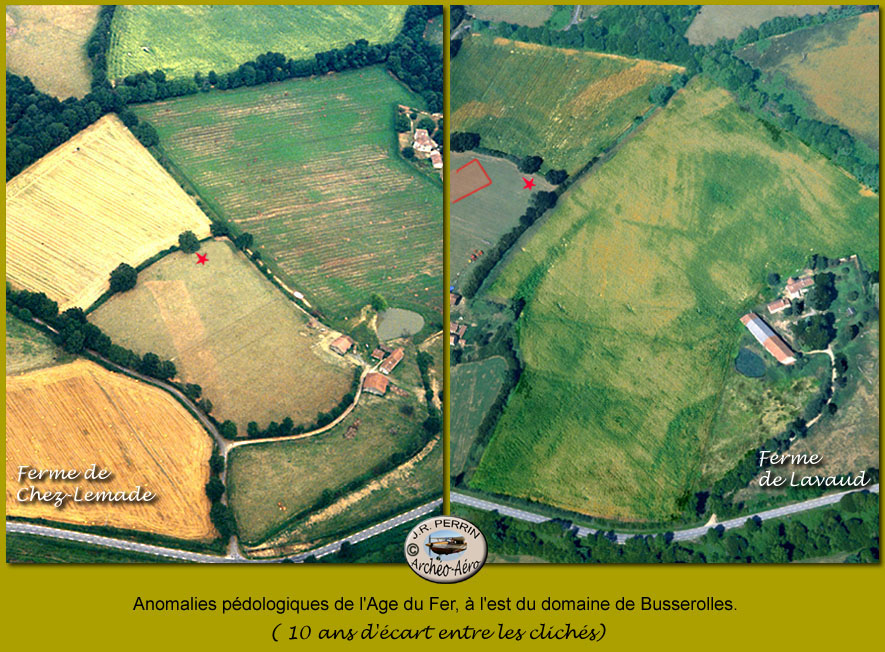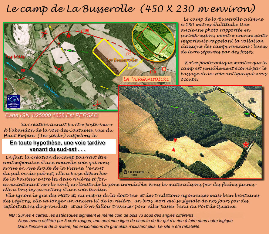 A l'archéologue de tenter de les retrouver, d'en découvrir le sens et d'en tirer profit. Entre autres choses plus ou moins signifiantes : l'arrivée à la limite sud du domaine de Busserolles du diverticule venant de la voie des Coutumes et dont la trace apparaît encore, remontant à peu de distance, l'allée actuelle du domaine. Et non loin, à droite, les anomalies pédologiques ( qui ont trait à la nature et à l'apparence des sols ) de Chez-Lemade et de Lavaud, déjà évoquées en seconde page : "Gaulois et gallo-romains". . . (petites flèches rouges). Alors et tout à la fois une tradition gauloise qui perdure et une romanité qui s'implante : l'époque gallo-romaine quoi ! |