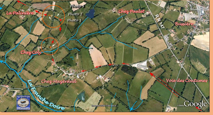 Les photos aériennes sont particulièrement parlantes (mais non vérifiées au sol rappelons-le ! ) lors de l'arrivée de la Voie des Coutumes sur le bourg de Nérignac puis au passage à gué de la "Grande-Blourde" au lieu dit "Le Gas" : le passage à gué en vieil occitan ( tel le Gué-de-Joubert : " Gajoubert ", mais plus au sud, vers Limoges, on trouve plus couramment le terme "le Got"). Ce court passage qui aboutit au gué des Mâts sur la Vienne, nous a semblé intéressant à détailler car riche d'enseignements . Communes de Persac et de Queaux, département de la Vienne . ![]() Autour