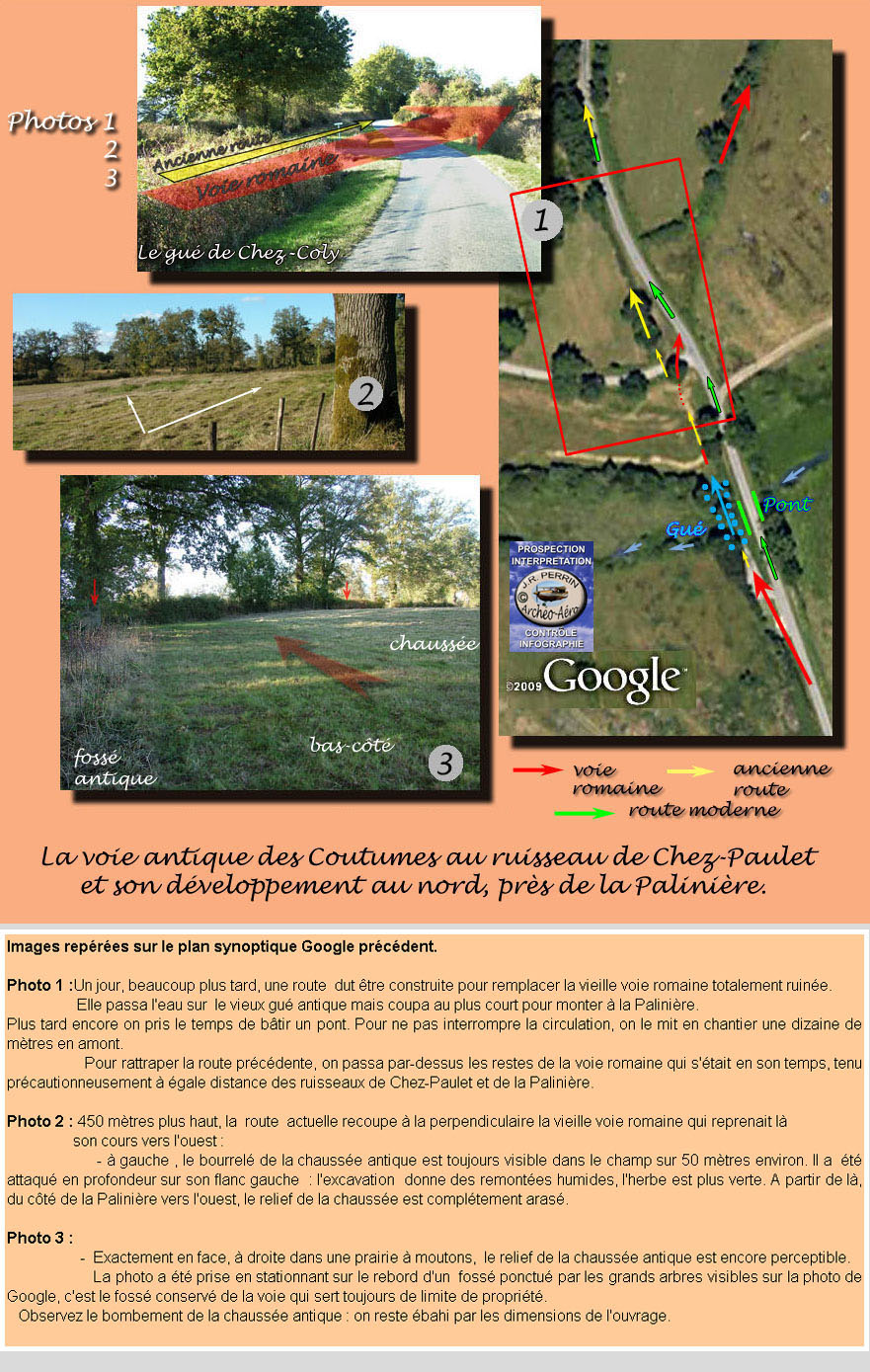 Il assume son choix de parcours vers Poitiers et plutôt que de s'allonger exagérément en contournant les zones humides par le nord, il pique à l'ouest pour aller passer à gué le ruisseau de Chez-Paulet en un endroit qu'il a choisi. Ceci fait il remonte franchement au nord pour éviter une tête de source et au niveau de la Palinière, il revient à l'ouest-nord-ouest sur une orientation qui l'amènera à distance, au Gué des Mâts sur la rivière Vienne. |