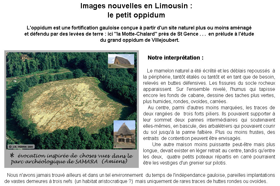 leurs maisons élevées en matériaux périssables, étaient entourées de levées de terre et protégées par des fossés. Devenus gallo-romains, leurs habitudes perdurèrent après la conquête. La classe aisée, très aisée, les remplaça de place en place, par des villas "à la romaine". Oppidum, villa, motte, enclos, cabane, sanctuaire, métallurgie, voies, pistes, modes agraires . . . |