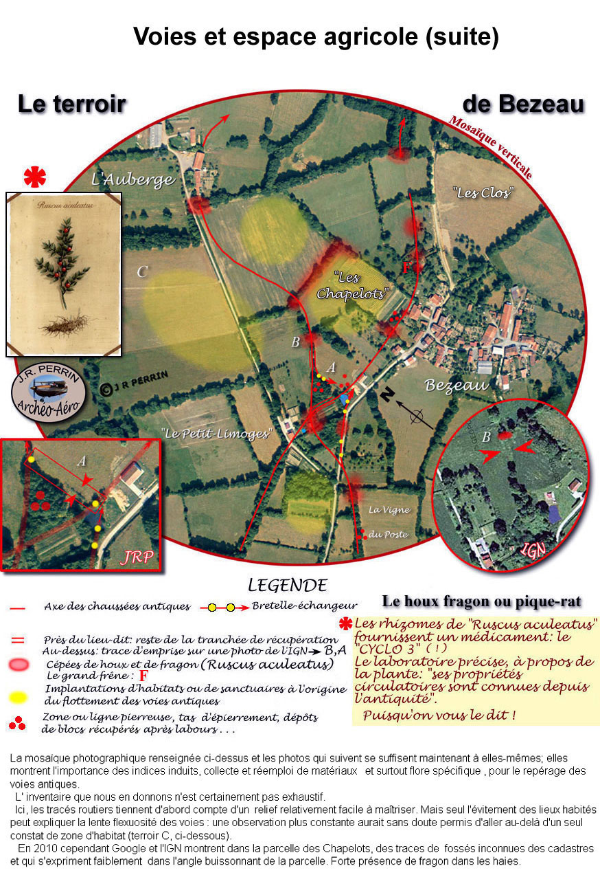 | 1 Grand Chemin des Landes : une ancienne voie romaine. Une cépée de houx arborescent. Sur ces très vieux rejets, les feuilles n'ont plus de piquants . 2 Bezeau, haut du village : sur le passage de la voie, un grand frêne au milieu d'anciens jardins. Le frêne aime les sols frais et profonds. Une importante touffe de buis est accolée au tronc, à l'opposé de la cabane : repèreF sur la mosaïque verticale . Le buis, arbuste calcicole marquait et marque encore l'emplacement de constructions, petites ou grandes d'époque antique. La chaux du mortier romain toujours présent dans les sols d'éboulis, contribue à entretenir un biotope favorable à cette plante. |