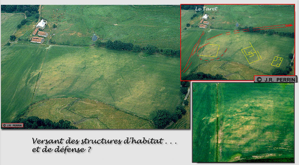 structures observées. Sur ce même panneau on remarquera, à l'est de l'ancienne ferme et en lisière des bois, une trace carrée légèrement engagée sous le couvert forestier, autour du point culminant de l'oppidum, le culmen. Il s'agit probablement d'un sanctuaire, un fanum, avec une possible cella centrale circulaire, prolongé par une esplanade de façade au sud-ouest : images au centre du panneau ci-dessus. Un chemin coudé émane de l'angle sud-est du sanctuaire et se dirige vers le Sud, vers la ferme actuelle du Taret. Des enclos carrés contigus, postérieurs à la ruine de l'édifice cultuel, se remarquent en surimposition; ils s'étendent vers le sud-est. Nous évoquons encore ci-dessus et ci-dessous la tombée aride (couleur claire) du murus secondaire de La Clautre qui forme la limite ouest d'un tertre. Sous certains aléas météorologiques, celui-ci semble bien recouvrir, des indices diffus d'enclos et de cheminements qui occupent le haut du terrain qui verse vers le Château du Muraud. Il faut savoir en effet que toute photo aérienne oblique sur un sol varié constitue, peu ou prou, une trahison topographique. La photo verticale apporte à cet égard, une distorsion moindre. Mais le rôle essentiel de ces documents, est de révéler au sol et de cibler des indices qui resteraient illisibles sans le recul que donne l'altitude. Les techniques actuelles et à venir de la géodésie informatisée sont les premières bénéficiaires de cet éclairage : les photos de la prospection aérienne assument ainsi essentiellement un rôle précurseur mais déjà éclairant, pour les travaux de l'archéologie de terrain. |