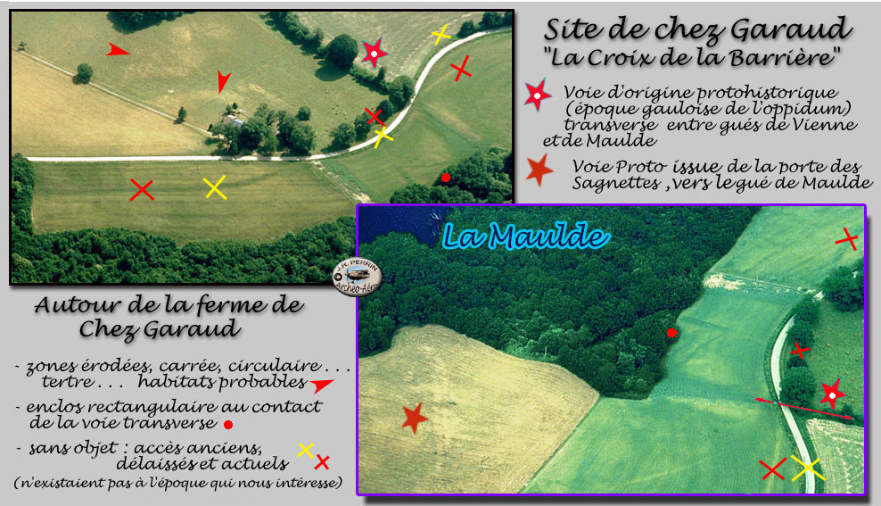 7 - Extrémité du "petit rempart" : porte inachevée (en vert) 8 - Parcellaires en damier : les " hortus" 9 - Ferme, annexes et parcellaires sur le plateau des Linières 10 - Aqueducs vers des structures d'habitat (villas gallo-romaines ?) . 11 - Porte des Sagnettes 12 - Route protohistorique Est d'accès à l'Oppidum 13 - Enclos rectangulaire sur la route de jonction des gués de Vienne et de Maulde. Emprise de structures d'habitats près de Chez-Garaud 14 - Eperon barré avec système de fortification d'entrée. Plus loin à l'est, traces d'un chemin d'accés à un habitat éventuel, sur un replat de confluence, au sud des Champs (voir mosaïque verticale). |